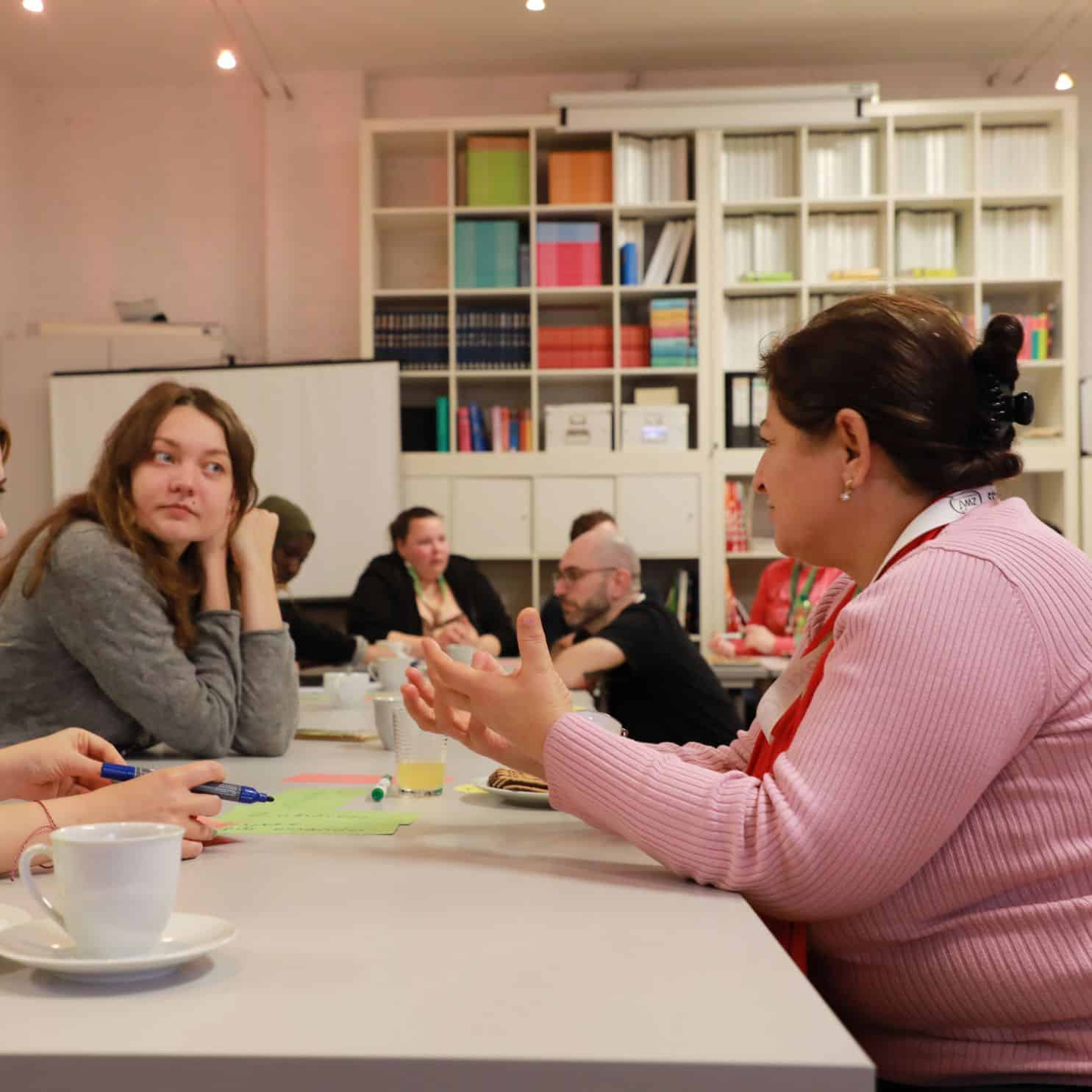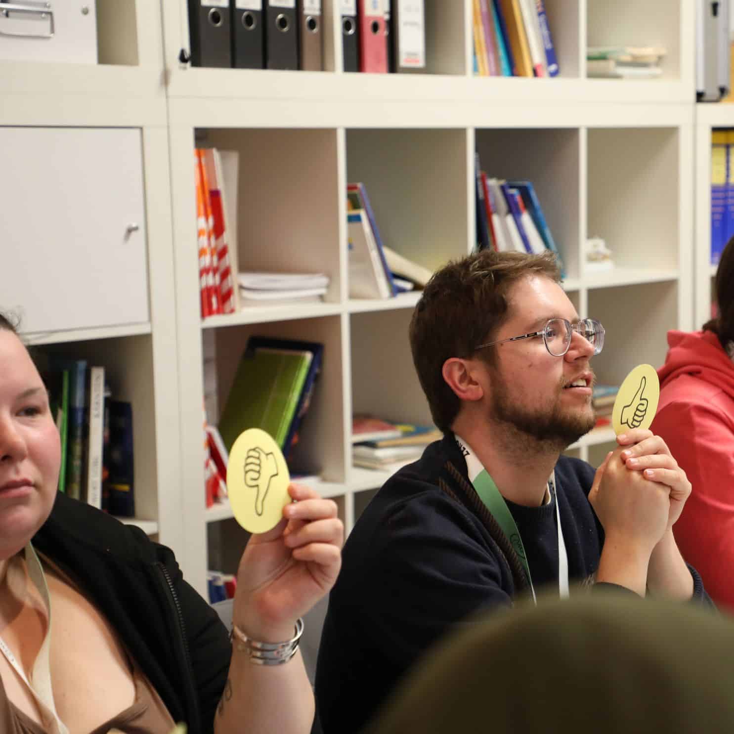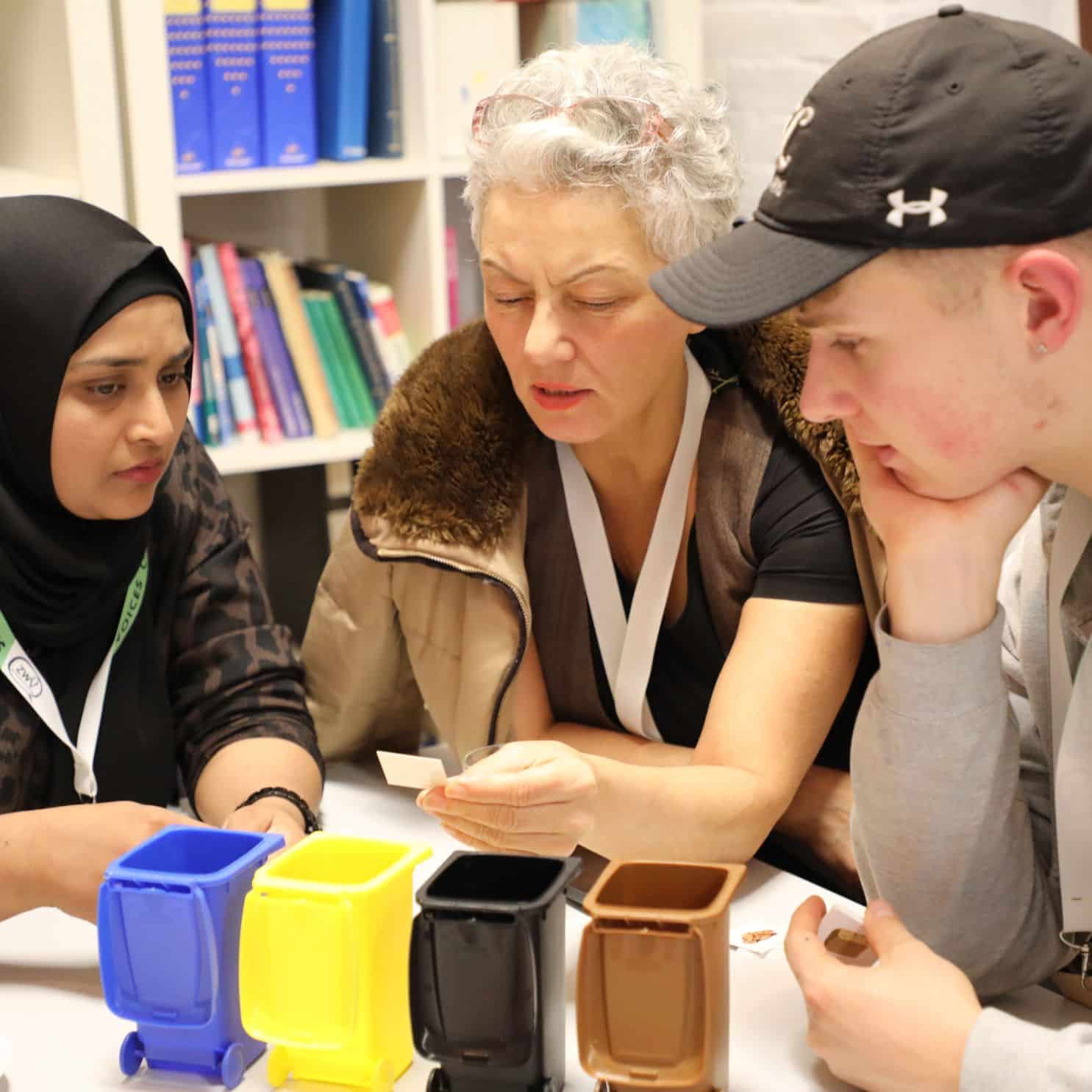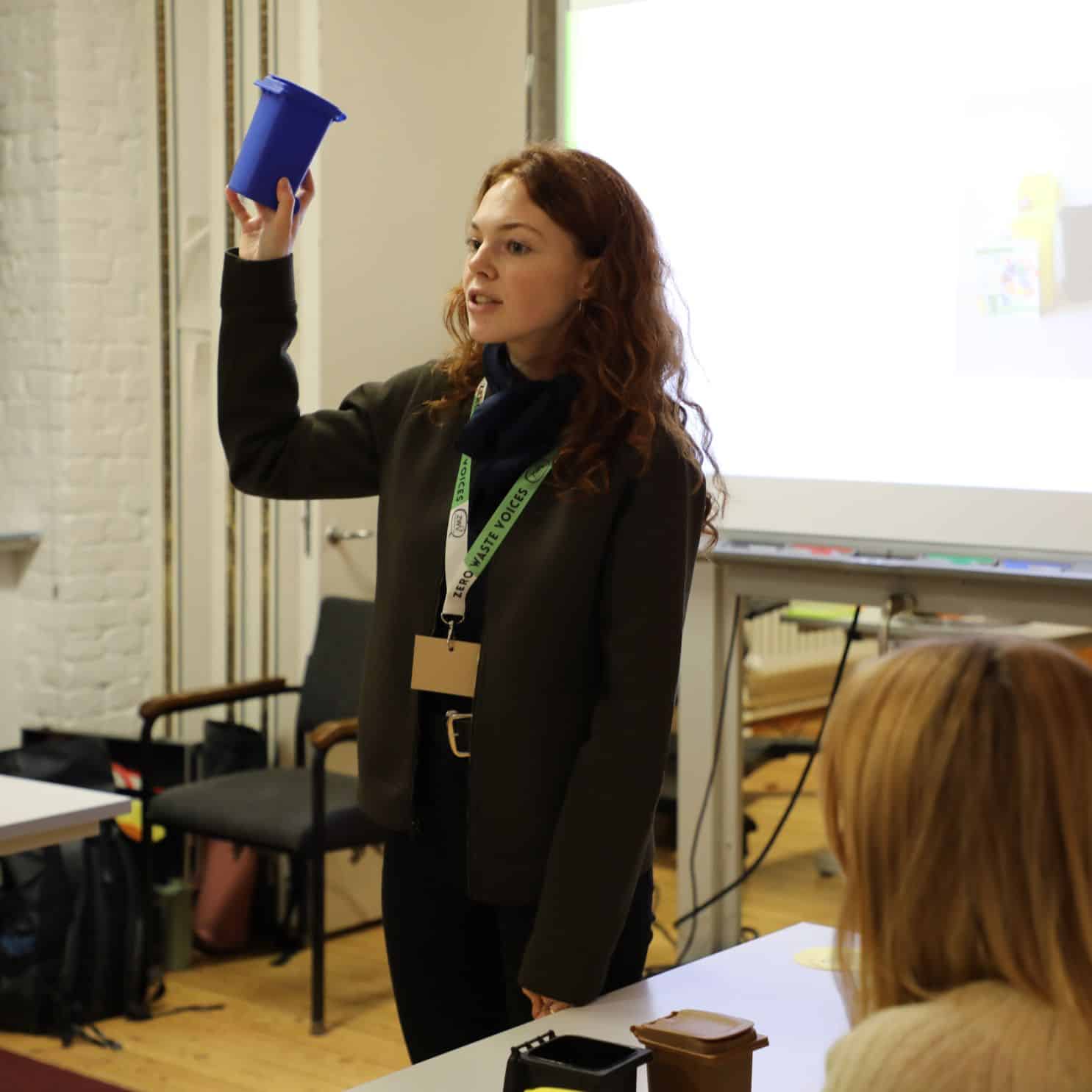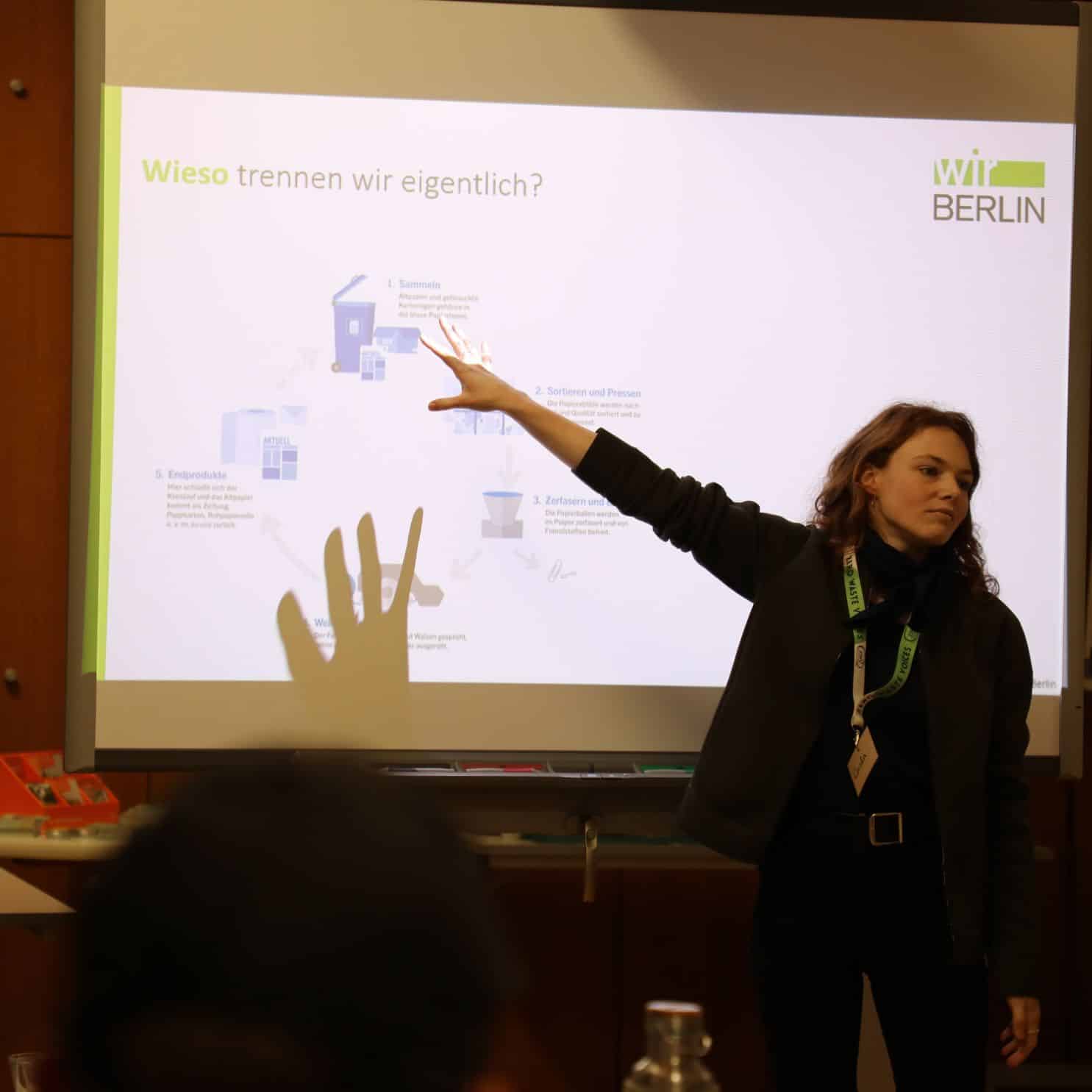 Wir bieten unseren MÜLL-KNIGGE auch Unternehmen in Form eines interaktiven Workshops an. Gemeinsam mit den Teilnehmenden nehmen wir die Berliner Mülltonnen unter die Lupe und testen in einem spielerischen Trennspiel das Wissen zur Mülltrennung. Außerdem räumen wir mit gängigen Recycling-Mythen auf: Müssen Verpackungen wirklich ausgespült werden? Oder gehören Bankkarten in die Gelbe Tonne? Der Workshop vermittelt anschaulich, praxisnah und mit Spaß, wie richtige Abfalltrennung gelingt.