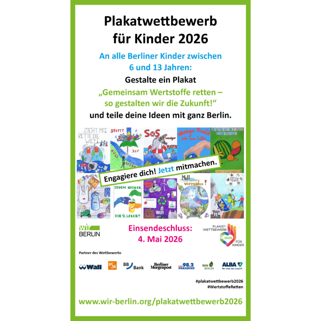 Berlins Kinder haben eine klare Vorstellung von ihrer Stadt und ein sensibles Gespür für aktuelle Themen der Gesellschaft. Seit 2015 ruft wirBERLIN mit einem jährlichen Plakatwettbewerb Berliner Kinder im Alter von 6 – 13 Jahren auf, sich Gedanken um unsere Stadt und ihre Umwelt zu machen, entsprechende Plakate zu entwerfen und so zu Botschafter*innen für die Welt von morgen zu werden. Das diesjährige Motto lautet: „Gemeinsam Wertstoffe retten – so gestalten wir die Zukunft!“.